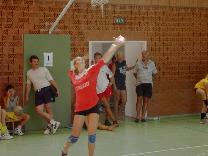 A Magyar Röplabda Szövetség főtitkára figyeli a magyar válogatott egyik játékosának nyitását. The Secretary-general of the Hungarian Volleyball Federation is watching one of the players of the Hungarian National Team.