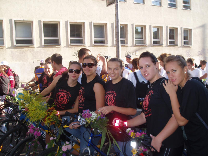 A Virágkarnevál előtti kerékpáros felvonuláson a chileiek a mezeikben, az Eötvös DSE lányai pedig a 13. Eötvös Kupa emblémázott pólóiban vettek részt.