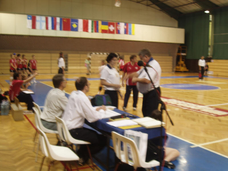 Béla Szőke, worked as a second referee for some rallies, was sent-off from refereeing on the final of the Eötvös Cup. On the picture he gives the whistle symbolically to Gréta Rejtőné Papp, an illustrious member of the next generation.