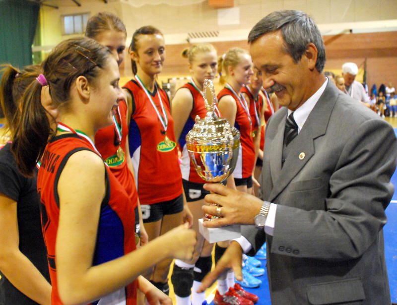 Dr. Sándor Kiss, the autonomous deputy of the district of the Eötvös Primary School, gives the cup to the winner of the girls.