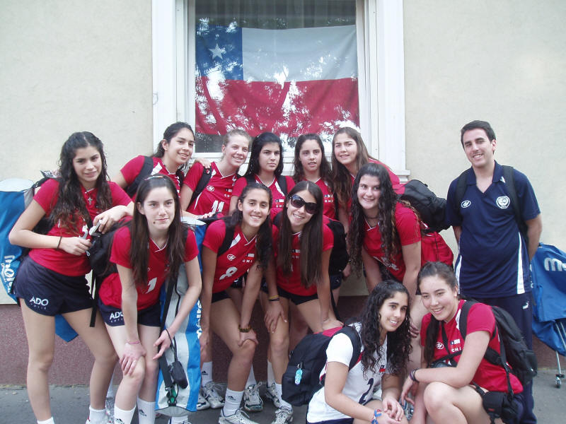 The girls from Chile with their coach, Italo, under the flag, sewn for their glory.